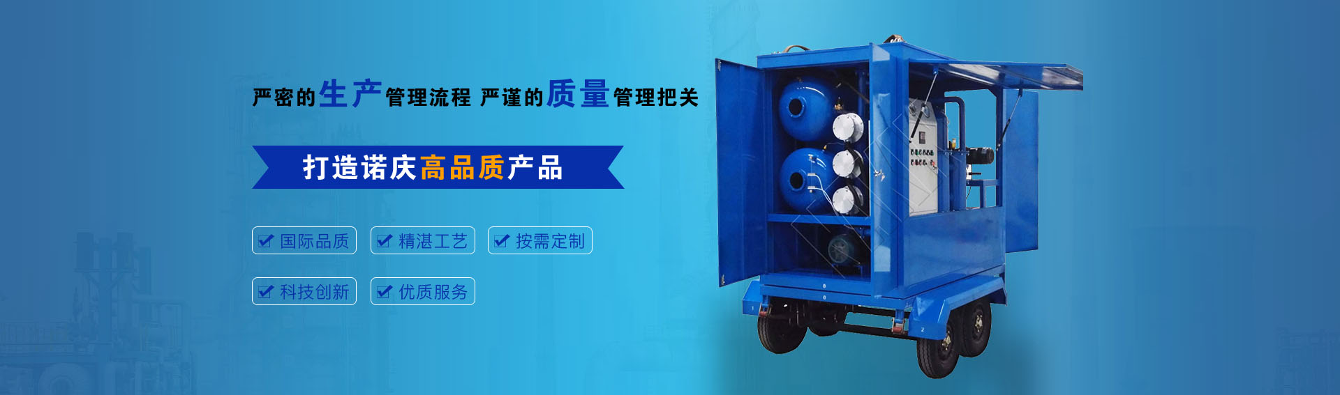 公司通過ISO9001-2015質量管理體系認證,CE歐盟認證,諾慶公司所有濾油機配套產品均采用國內外知名品牌,經過多年的使用,具有質量可靠,性能優良。公司擁有完備的檢測儀器和檢測設備,所有產品出廠前經過嚴格測試,保證每一臺產品合格出廠。